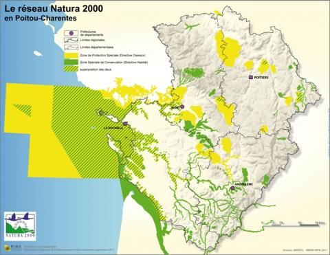 La Région Poitou-Charentes compte 82 sites Natura 200 sur une surface terrestre de 333 225 ha , soit 12,86 % de la surface régionale (plus 675 000 ha en mer):